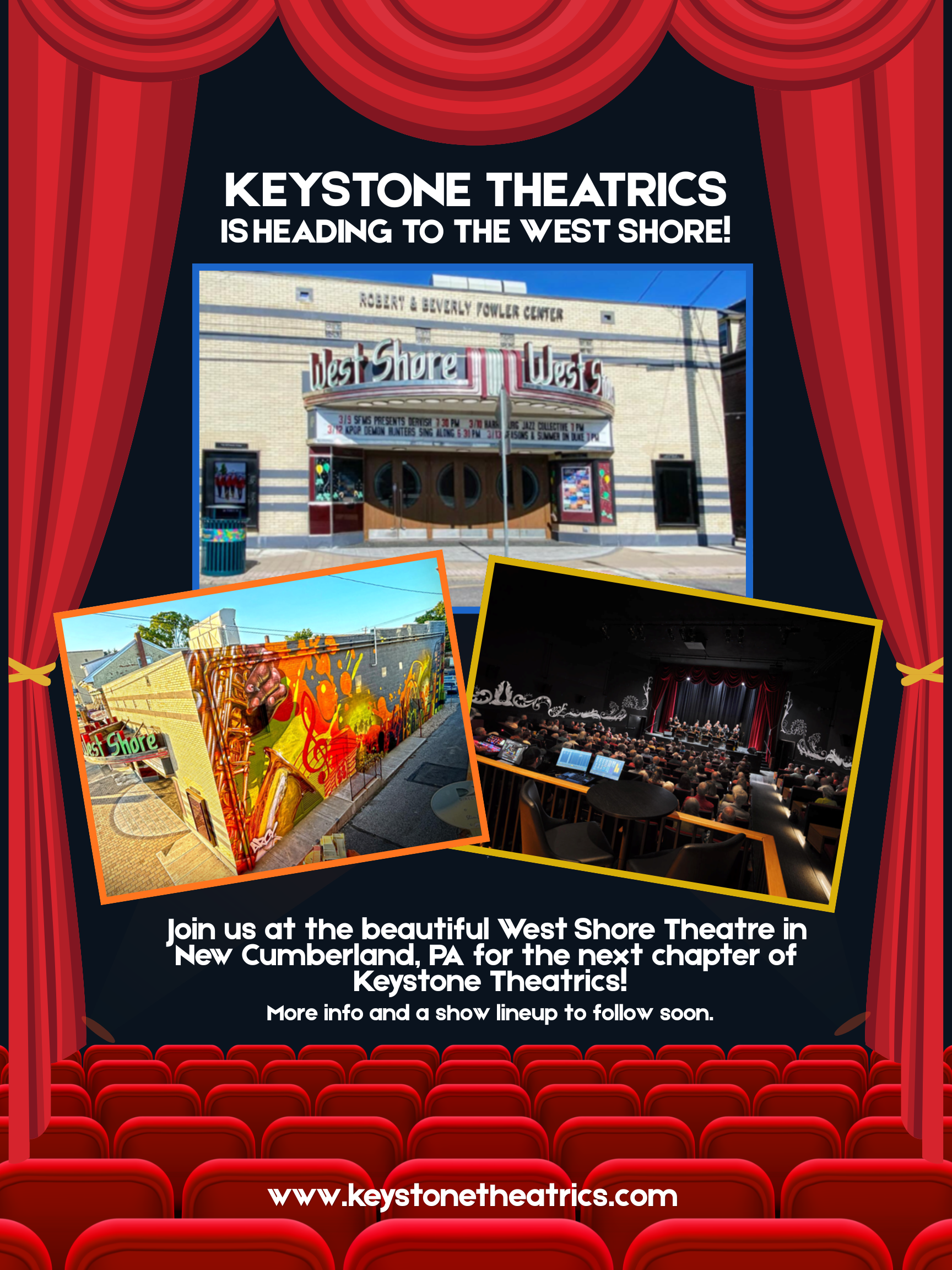 Stay tuned for an announcement of our second half 2026 mini season featuring an August, October, and December production. The mini season will look a little different than you’re used to as we bridge the gap between our last full season and the next, but we’re working on a full 2027 lineup as we enter the exciting next chapter of Keystone Theatrics. We can’t wait to continue to bring central PA audiences high quality theatrical productions at the West Shore Theatre!